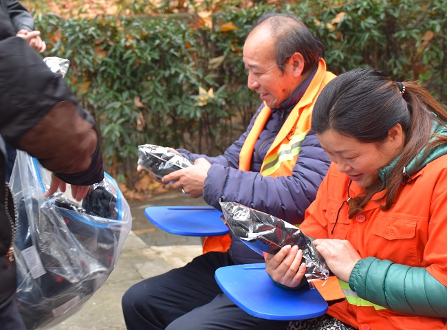 结束清扫,环卫处负责人刘主管鼓励到,这次活动不仅可以帮助环卫工人减轻工作量,同时也能够为同学们创造一个干净的校园环境,是当代研究生良好精神面貌的具体体现。张阿姨表示,这次义务清扫落叶活动是一个很有意义的活动,也切实地帮助到了环卫工人的工作,大家干劲足,上午效果很好,很欢迎也很感谢同学们。最后,团员们给卫工人们送了精心准备的保暖手套,表示了自己的关心和感谢。