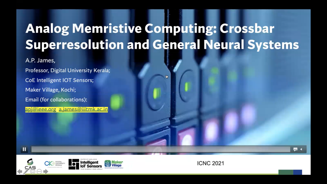 印度信息技术和管理学院教授Alex James作了题为“Analog Memristive Computing: Crossbar Superresolution and General Neural Systems”的线上报告,介绍了创建超分辨率节点的技术,讨论了它们在构建各种神经网络中的应用,还概述了模拟忆阻计算及其更广泛的含义。