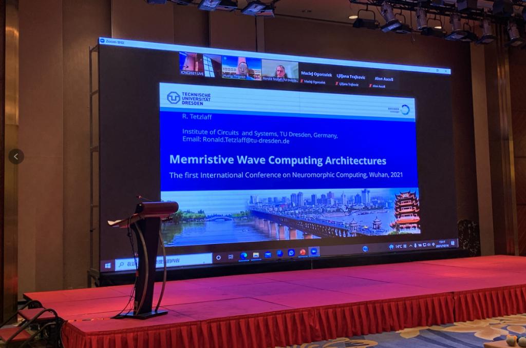 德国德累斯顿工业大学Ronald Tetzlaff教授作了题为“Memristive Wave Computing Architectures”的线上报告,介绍了忆阻器和非冯诺依曼计算系统的特点和优势,然后阐述了元胞波计算和忆阻单元非线性网络特性,最后展示了其团队的主要研究方向。