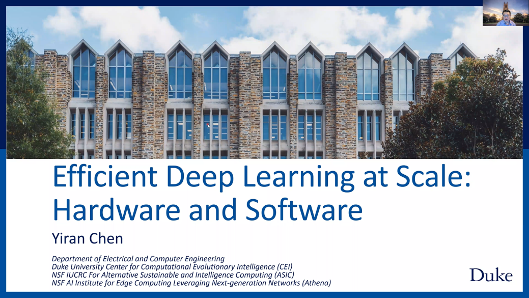美国杜克大学陈怡然教授作了题为“Efficient Deep Learning at Scale: Hardware and Software”的线上报告,阐述了异构人工智能计算系统的设计思想,提出了几种硬件友好型神经网络模型压缩技术,并简要介绍了协同设计流程的自动化技术。