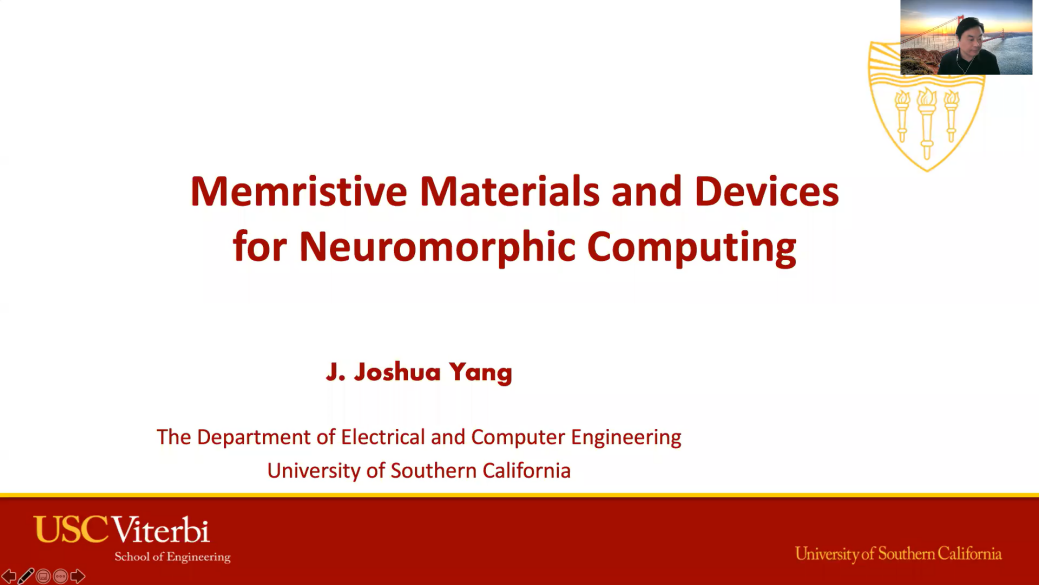 美国南加州大学杨建华教授作了题为“Memristive Materials and Devices for Neuromorphic Computing”的线上报告,介绍了忆阻材料和设备在高效计算方面的前景和挑战,讨论了不同层级的生物启发例子:监督在线学习的深度神经加速器、用于分类的神经计算、以及另外一些计算应用等。