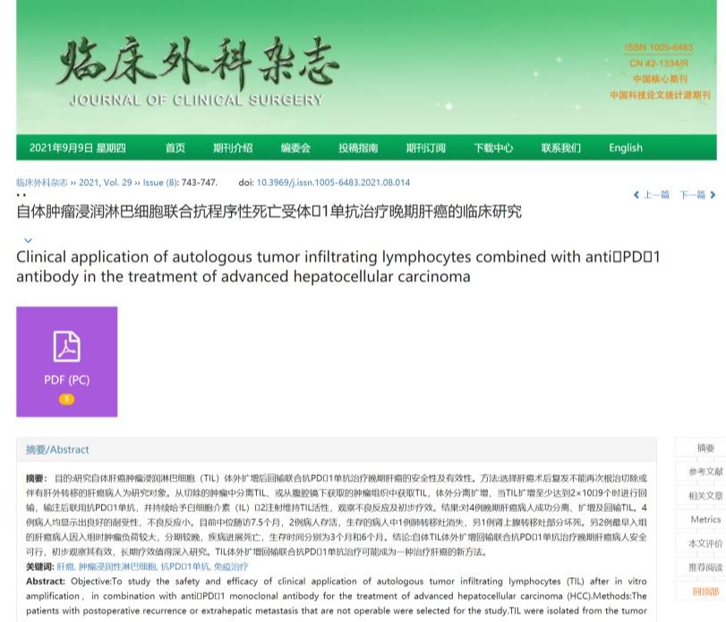 中华医学会《临床外科杂志》在线发表了德赢官网Vwin,德赢AC米兰官网同济医学院附属同济医院肝胆外科黄志勇团队与德赢官网夏天团队的题为“自体肿瘤浸润淋巴细胞联合抗程序性死亡受体PD-1单抗治疗晚期肝癌的临床研究”的研究成果。此工作为全球首次报道自体肿瘤浸润淋巴细胞(Tumor Infiltrating Lymphocytes, TIL)疗法技术在晚期肝癌中的临床试验,并观测到良好的安全性与有效性。