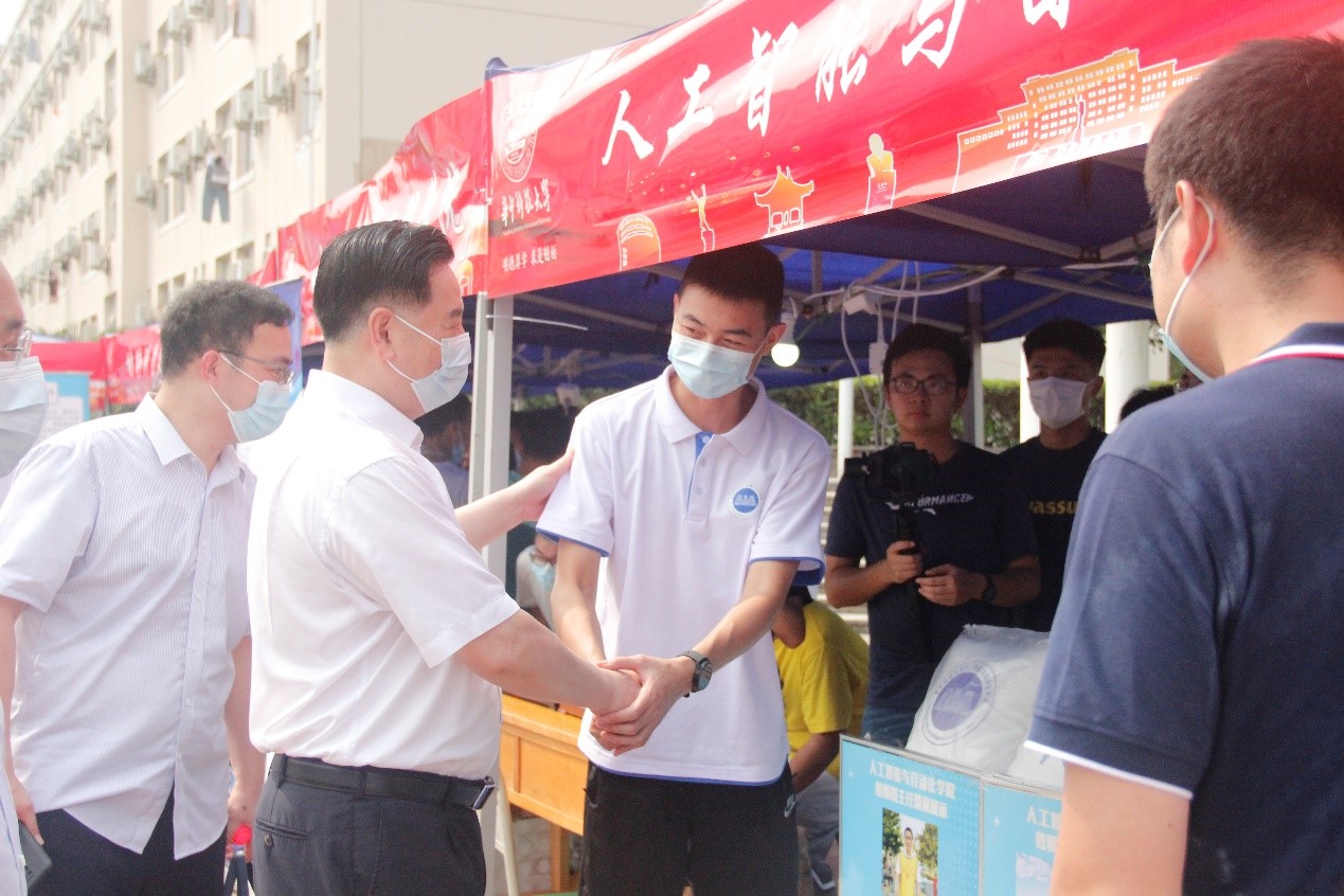 迎新当天,校党委书记邵新宇、校长李元元一行和校党委副书记、纪委书记周建波、研究生院院长马彦琳一行分别来到学院本科生和硕博生迎新现场,详细了解了学院的招生和迎新情况,与办理报到手续的新生、本科生教师班主任、辅导员和迎新志愿者亲切交流,并在印着AIA专属吉祥物小AI的抱枕上写下寄语签名,赠予新生。