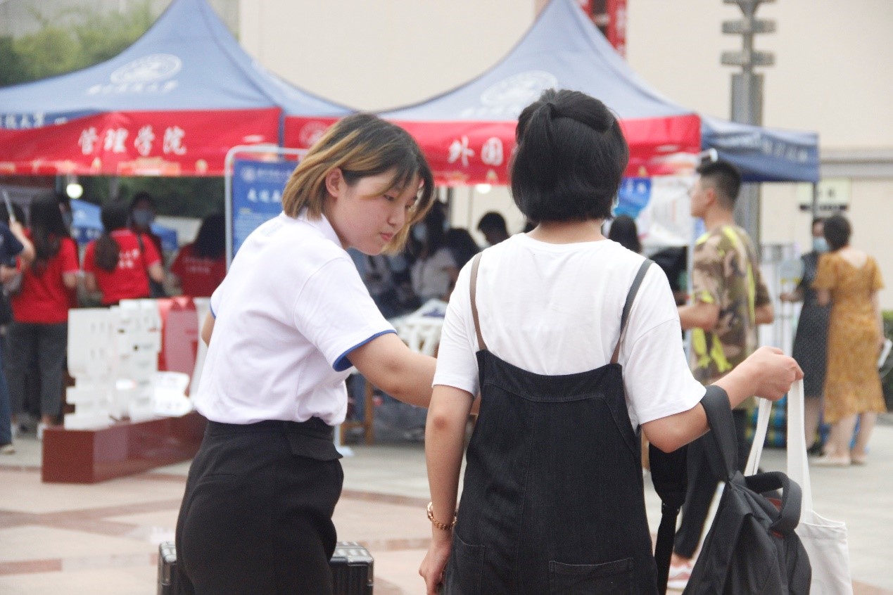 此外,忙碌在学院迎新点的还有这样一群“双重身份”的志愿者,本科毕业于本院的十余名硕士新生,他们同时也担任了本科生新生研究生班主任。9月1日-2日,他们从清晨便开始和其他志愿者、研究生班主任一起,早早来到爱因斯坦广场布置迎新现场,等待本科生新同学的到来,耐心指导他们完成报到手续,帮助将行李安置到新生宿舍。