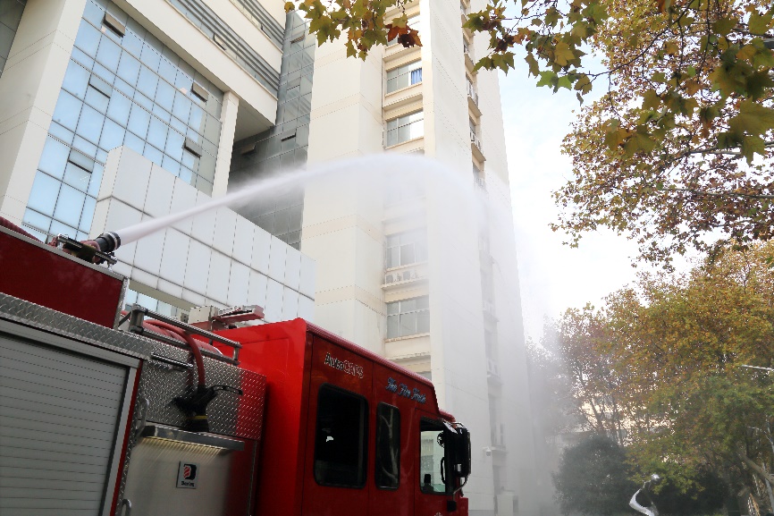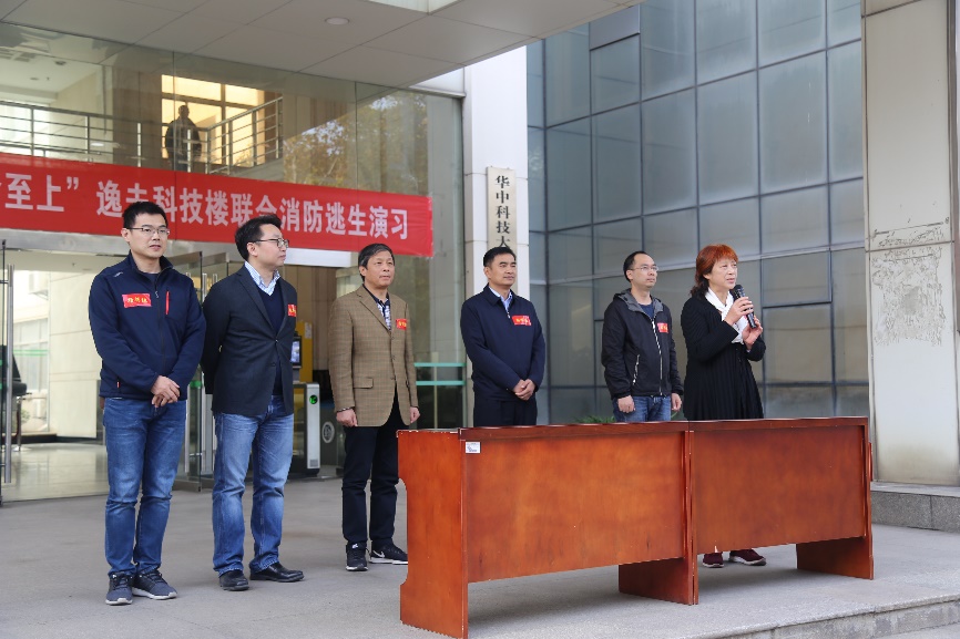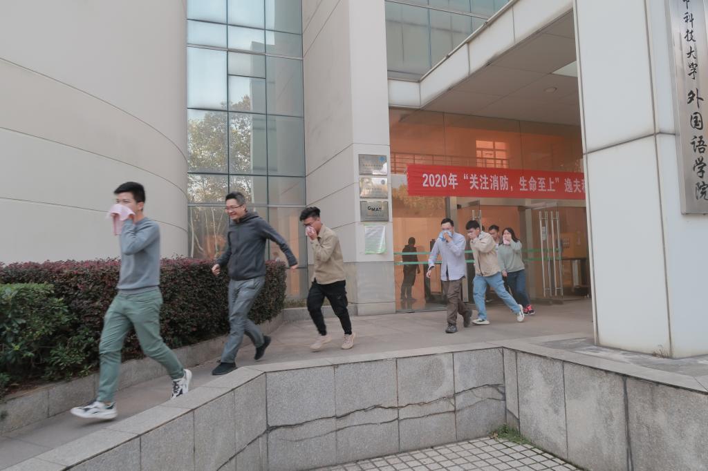 演戏开始前,外国语学院党委书记刘芳进行了活动动员,向大家强调了在学习科研期间也要重视消防知识的学习。随后消防演习正式开始,洪山区消防总队的消防战士们首先在科技楼内释放了四枚烟雾弹来模拟火情,随后外国语学院的几位同学以小剧场的方式为大家展示了火情发生时,同学们应该采取怎样的措施,再次强调了火灾发生时要冷静应对。外国语学院研究生代表赵亚琳讲解火场逃生基本知识,在与119火警通话的过程中,要迅速交代清楚火情发生的位置、火灾原因、有无被困人员等基本信息。同时,科技楼内的师生代表,纷纷用湿毛巾捂住口鼻从消防通道逃离到安全位置。