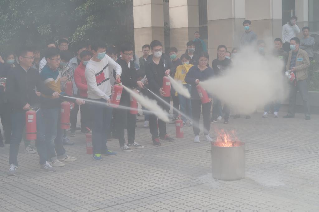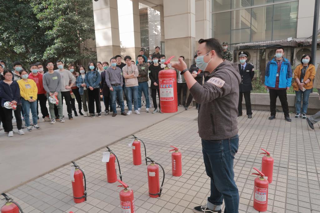 演习结束后,师生们来到科技楼西侧开展消防设备使用培训,在保卫处专业老师指导下积极使用灭火器进行实操演练。