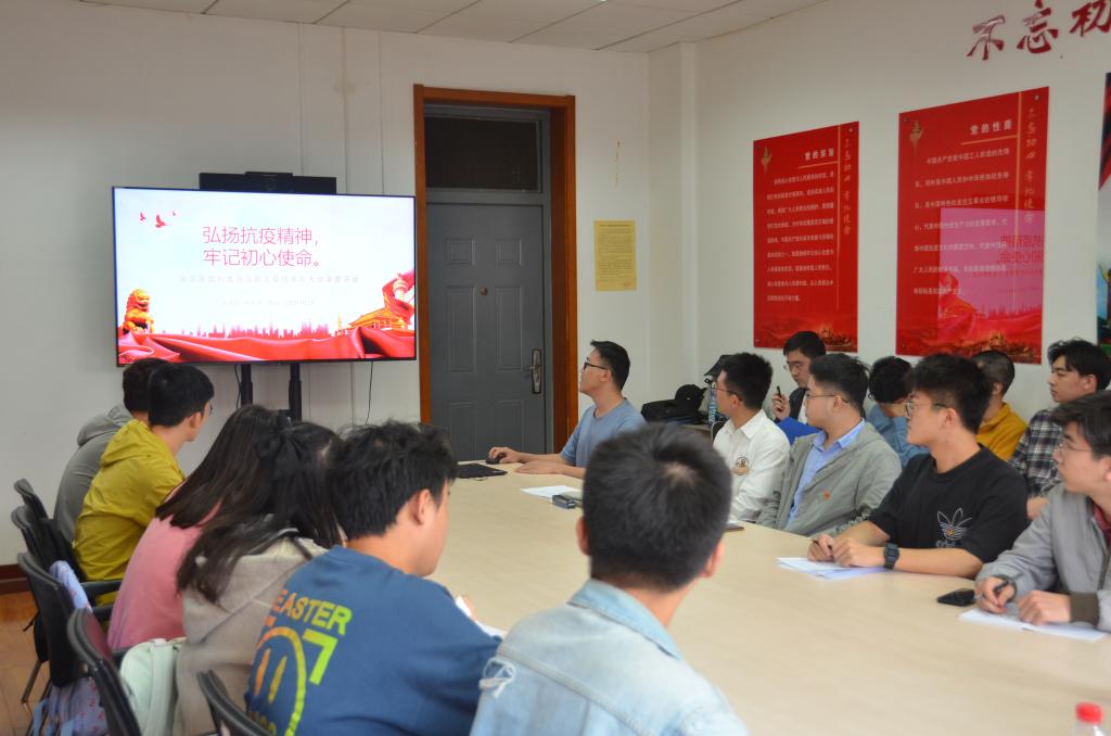 支部书记戴志伟组织党员签到后向党员简要介绍了此次组织生活内容。在支部党员讲授微党课部分,孙哲宇讲授了一堂以“弘扬抗疫精神,牢记初心使命“为主题的微党课,带领支部成员重温习近平总书记在全国抗击新冠肺炎疫情表彰大会上的重要讲话精神。