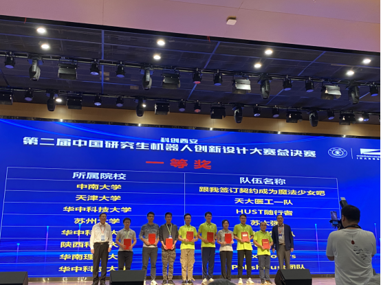在比赛开始的前三周,团队成员紧锣密鼓地做着机器人调试、作品视频拍摄、演示文档修改、海报和宣传册设计等工作。团队成员提前一天到达西安交通大学,在认真布置完展位后就立刻前往教室进行答辩预演,经过反复练习与修改后取得了满意的效果。25日下午,团队成员一起学习了特等奖答辩的作品,受益良多。在之后的颁奖典礼中,团队最终荣获全国一等奖。
