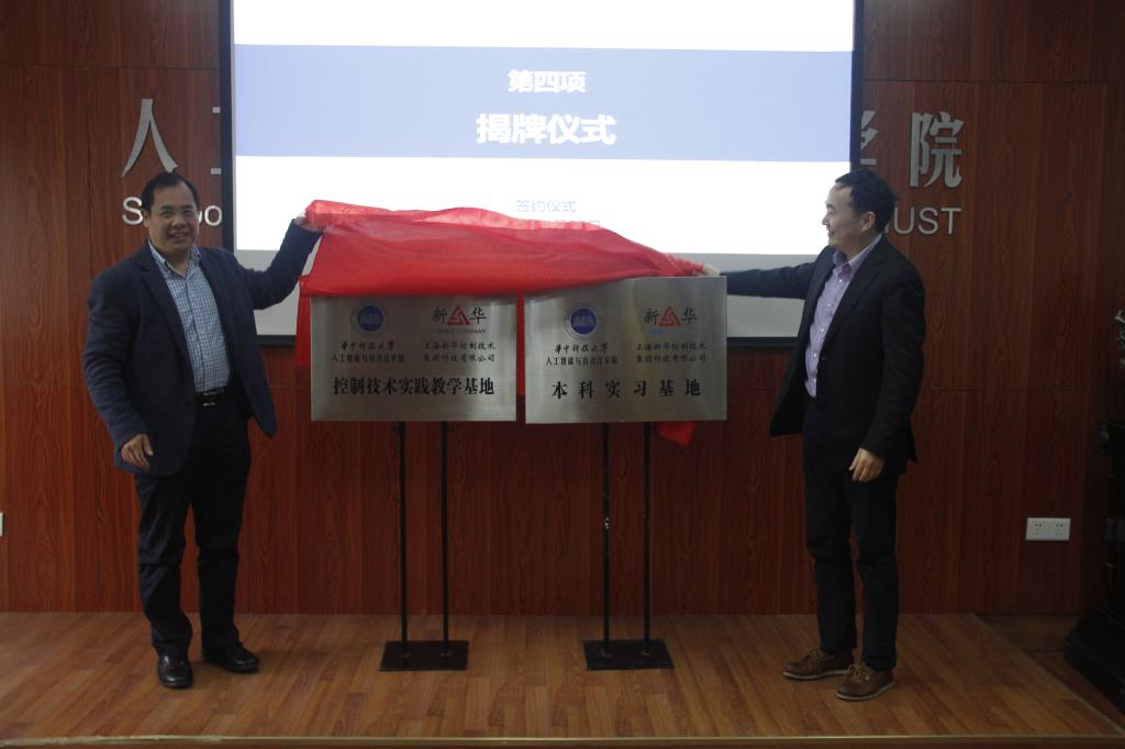 在现场师生的见证下,学院副院长潘林强、实验教学中心主任何顶新代表学院,同陈光远共同签署了控制技术实践教学基地、本科实习基地共建协议。张耀和陈光远共同为基地揭牌。