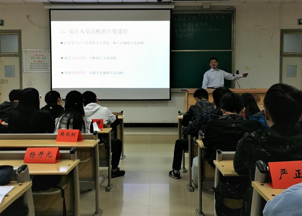 29日校党委组织部组织员陈业美老师以自己青年时代入党的经历为例,为学员们详细讲述了入党的条件和基本程序。他强调,入党动机是每一个申请入党者首先要面对的问题,要通过不断地学习和实践确立正确的入党动机。陈业美指出,发展党员要坚持“入党自愿,个别吸收,成熟一个,发展一个”的基本原则,从入党积极分子到正式党员这个过程中,培养、教育、考察和转正所有环节都要注重规范程序。
