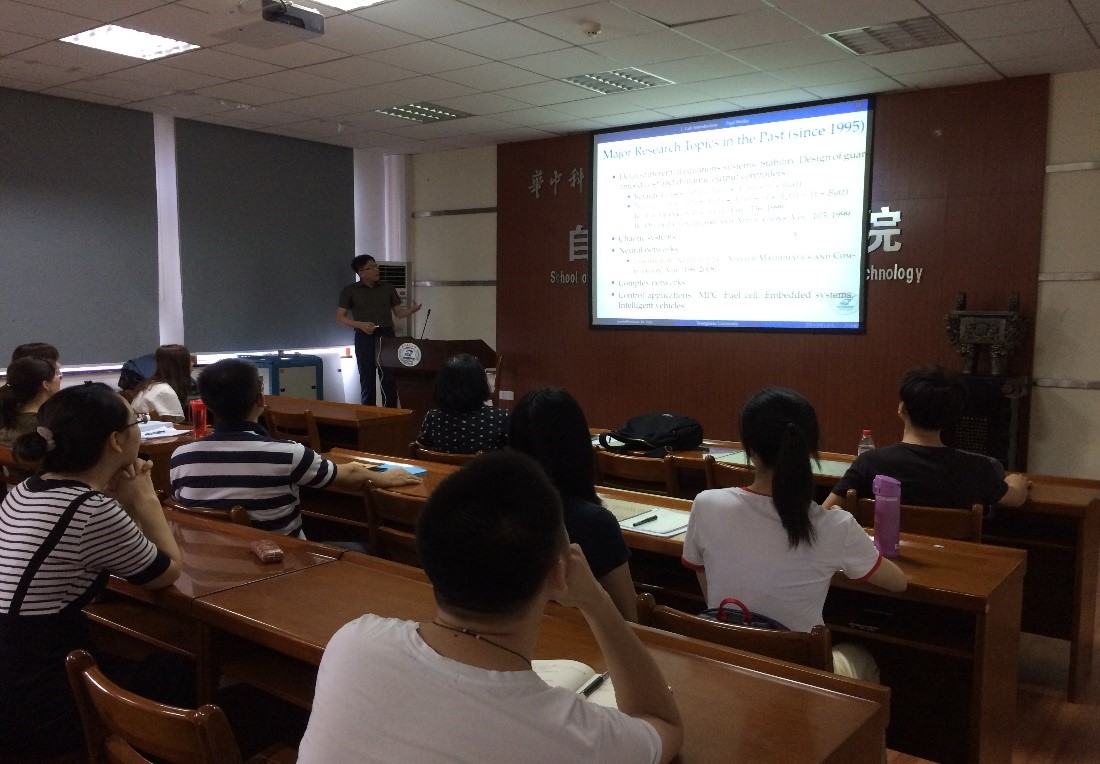 本次报告中Park教授首先简略介绍了岭南大学“Advanced Nonlinear Dynamics and Control”实验室的主要研究方向,包括:马尔科夫跳变系统、网络化控制系统、故障诊断及容错控制、模糊系统、神经网络。并由浅入深地介绍了有关时滞系统稳定性以及动态网络系统同步的最新成果。针对时滞系统Ju H. Park教授首先介绍了传统的时滞系统的稳定性分析方法,并指出降低稳定性判别条件的保守性和计算负担是改进的目标。对于降低保守性可采用加零不等式、引入自由权重矩阵、改进李雅普诺夫函数、划分时滞区间等方法。紧接着Ju H. Park教授指出现有的处理时滞工作主要致力于通过不等式和自由权重矩阵来降低保守性,并详细介绍了团队通过改进李亚普洛夫函数从而获得保守性更小的稳定性判别定理的最新研究成果。针对复杂网络系统Ju H. Park教授也详细介绍了两个相关工作,包括:一类具有参数不匹配以及时变时延的异质耦合神经网络系统的准同步问题,通过平均脉冲方法和比较原理获得相关结论;以及惯性神经网络在量化采样控制下的同步问题。