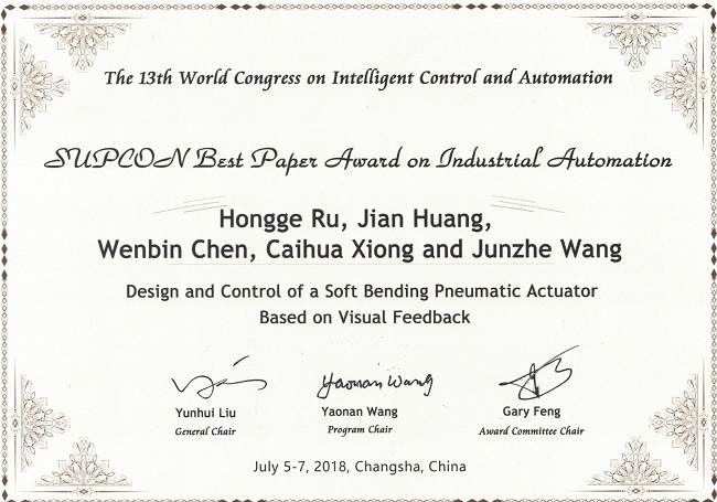 软体机器人是当前机器人领域热点之一,相较于传统刚性机器人,弯曲软体气动驱动器在康复医疗、智能假肢、助力辅助等领域的应用中有着广阔的前景。同时基于高速单目相机的视觉识别,一定程度上实现了弯曲气动肌肉的反馈控制,对此类驱动器的控制问题提出了一个可行的解决方案。基于此工作,在黄剑教授和机械学院熊蔡华教授共同指导下,茹宏格同学在会场做了题为“Design and Control of a Soft Bending Pneumatic Actuator Based on Visual Feedback”的学术报告,并获得“Best Paper Award”。