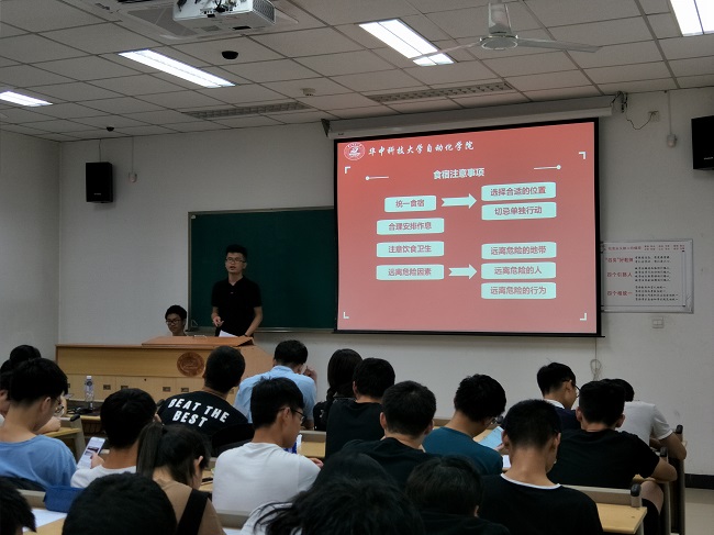 电信中英班邹琪珺同学作为历届参加暑期社会实践并获得校级优秀团队的学生代表,结合实践经历分享了关于实践宣传的技巧和经验。自动化学院分团委学生副书记陈思宇分别从食宿安全、合理着装、安全出行、安全汇报、疾病预防、财产安全等方面向同学们进行社会实践安全注意事项介绍和强调。