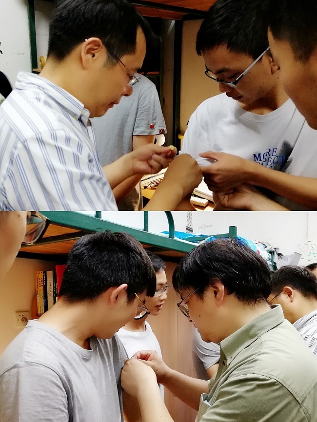 晚餐后,学院领导来到韵苑26栋看望毕业生。在自动化1404班宿舍,班长介绍了班级在大学期间课程学习、公益实践、科技创新、文化活动等成长历程,经过四年的磨砺,24名同学从入学时的青涩少年,到毕业时的9人录研5人出国深造率60%、就业率100%的满意答卷。在自动化1402班、自动化1406班、物流1402班等宿舍,院领导了解了学生的学习情况、生活情况以及毕业去向等,为毕业生佩戴上纪念校徽,表达了学校学院对同学们的深情牵挂和美好祝愿,希望同学们带着HUST烙印在新的征程上,展翅高飞,再创辉煌,以更优异的成绩回馈母校和社会。