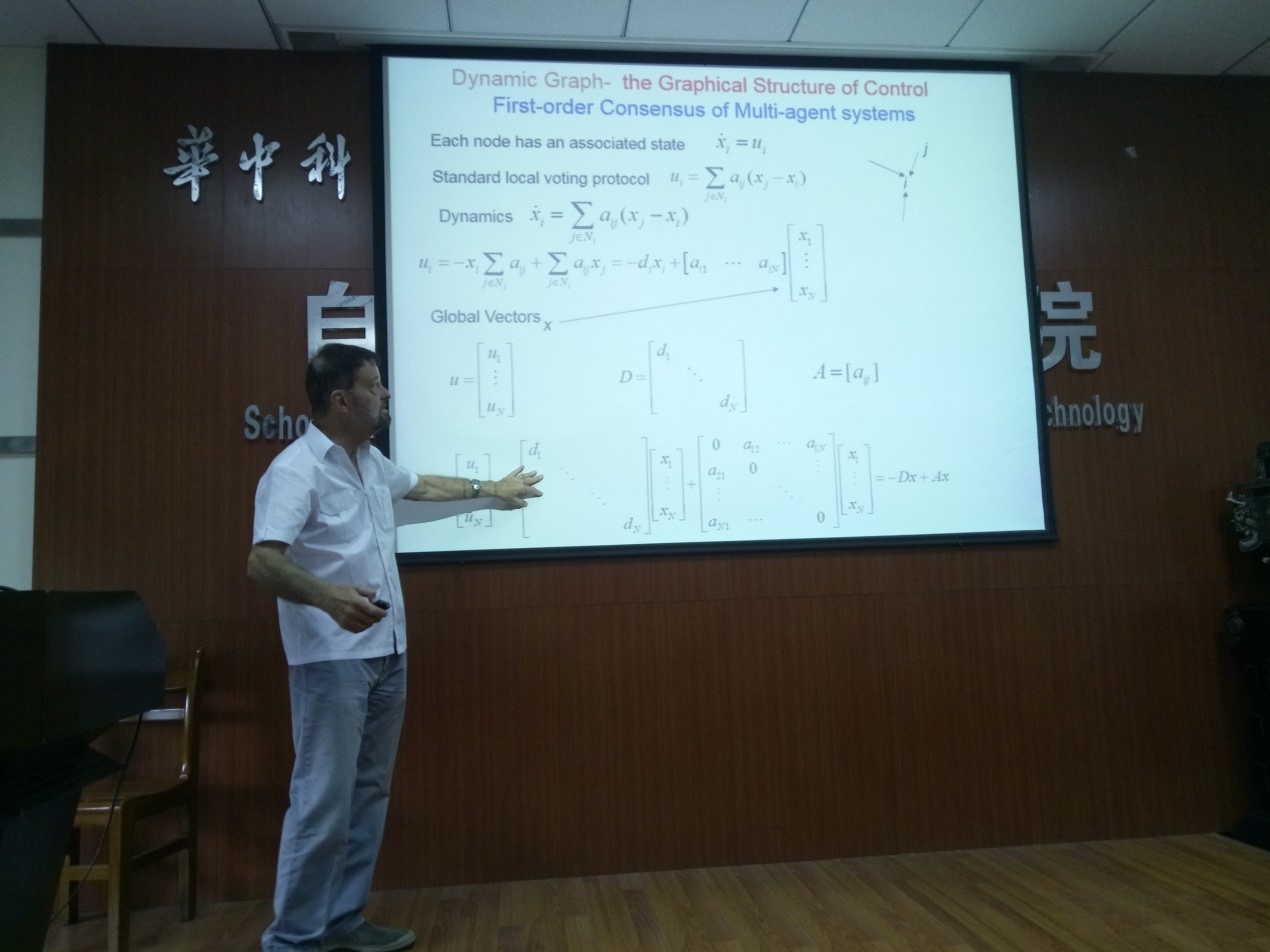接着是Frank Leroy Lewis教授带来题为“Cooperative Control Synchronization: Optimal Design and Games on Comunication Graphs”的报告。F. L. Lewis教授是美国德克萨斯大学阿灵顿分校(UTA)电气工程系的Moncrief-O'Donnell名誉教授,美国国家发明家学会会员,IEEE Fellow,IFAC Fellow,英国测控研究院院士,纽约科学院院士,德克萨斯注册职业工程师,英国工程委员会特级工程师,UTA杰出学者学会发起人(2004) ,UTA杰出教师(2012),IEEE控制系统协会杰出讲师(2012-2014),地中海控制协会理事会的创始成员。曾担任希腊德谟克利特大学、中国香港科技大学、香港大学、香港城市大学、新加坡国立大学和南洋理工大学的客座教授。获得IEEE计算智能协会神经网络先锋奖(2012),AIAA智能系统奖(2016)等各种奖项。目前的研究兴趣包括智能控制、图的分布式协同控制、非线性系统、强化学习、过程控制、基于条件的维护和神经系统。是7个美国专利的所有人,发表300多篇期刊论文,400多篇会议论文和20本书籍。担任多个国际杂志的编辑委员会委员。自1982年以来,获得由美国国家科学基金会(NSF)提供的NSF研究启动资助和持续资助。自1991以来,他已经获得了来自NSF、ARO、ONR、AFOSR以及包括国防部重大SBIR等政府项目和其他工业项目等共计800万美元的资金。在1996年,他的SBIR项目帮助他在ARRI获得了美国SBA Tibbets奖。