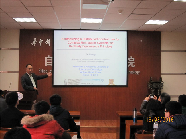 3月19日上午,香港中文大学黄捷教授应关治洪教授邀请来德赢官网进行学术交流,并作了题为“Synthesizing a Distributed Control Law for Complex Multi-agent Systems via Certainty Equivalence Principle”的学术报告。报告会由关治洪教授主持,德赢官网教师王燕舞、张海涛、樊慧津、刘智伟、池明等40多位师生参加了报告会。