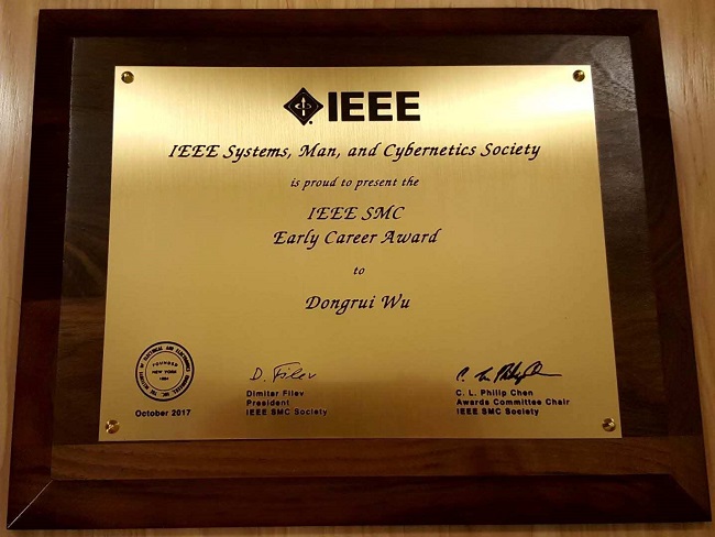 在2017年10月5至8日于加拿大Banff举行的 IEEE International Conference on Systems, Man and Cybernetics (SMC)上,我校自动化学院青年伍冬睿教授因在计算智能和脑机接口方面的研究取得突出进展,获得“IEEE SMC Early Career Award.”成为该奖首位获奖人,也是2017年度的唯一获奖者。该奖项2014年由IEEE SMC协会设立,旨在奖励35岁以下,在系统科学和工程、人机交互系统和控制论的理论和应用方面做出突出贡献的青年学者,每年全球授予1-2人,因评选要求严格,该奖项获奖者在2014至2016年间空缺。