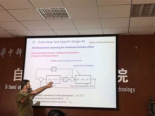 Lewis教授的报告围绕多机器人技术与人机交互问题展开。多机器人技术包括人和机器人在同一空间以团队方式合作工作。这促进人机交互系统能适应不同的人,并保证鲁棒性和稳定性。然后,Lewis教授着重介绍了人机交互系统里的内环和外环控制,提出了三种自适应HRI控制系统,帮助操作员以最小的工作量执行任务,并提高人机系统的整体性能。在内循环过程中,Lewis教授团队设计了一种机器人特有的神经自适应控制器,以使得未知的非线性机器人行为如操作员设计的机器人阻抗模型一般。在给定内环神经自适应机器人控制器的同时,Lewis教授提出了三种不同的外环设计。第一个是基于模型参考自适应控制的任务循环设计,第二个是基于自适应逆滤波设计,第三个是使用增强学习来优化机器人的性能。仿真结果表明,自适应HRI方法对人和机器人模型的变化有强鲁棒性。最后, Lewis教授和与会师生进行了热烈的交流,就相关学术领域展开讨论。