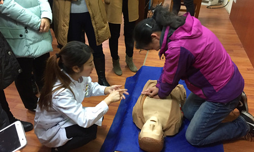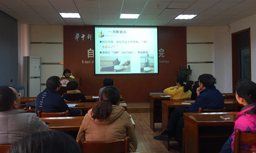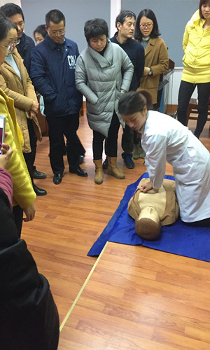 校医院外科主治医师郝洲华首先给大家做了日常外伤应急救治知识的讲解,针对骨折、失血、烧烫伤等外伤的应急处理和救助进行了详细介绍;随后,郝医生以2010版国际心肺复苏指南为基础,帮助大家认识掌握心肺复苏术的重要性,同时对心肺复苏术法概念、实施条件、心脏按压的作用,到实施心肺复苏术的六个操作步骤(判断意识、高声呼救、救护体位、胸外按压、畅通气道和人工呼吸)进行了详细讲解。一行前来的校医院护士用模型人向老师们展示了规范的心肺复苏程序,老师们也纷纷上阵,现场体验生命救助的“黄金4分钟”。