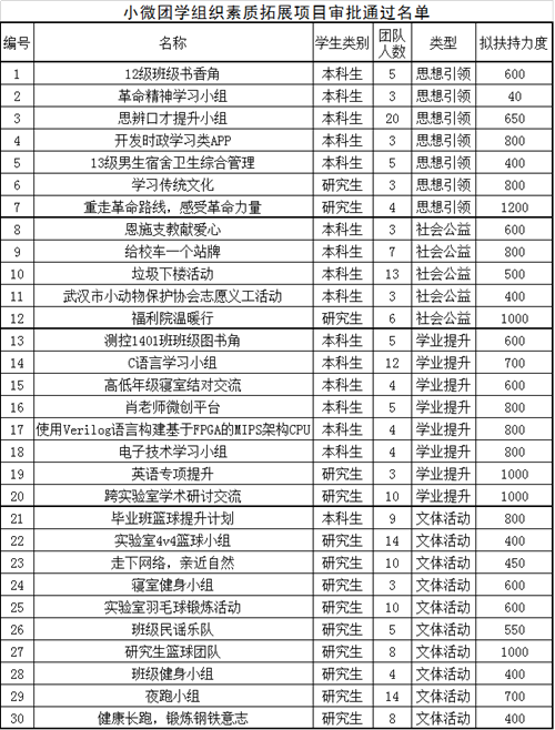 据悉,“自动化学院小微团学组织素质拓展项目”是自动化学院2015年度学生工作一项创新型实践探索活动,旨在进一步贯彻十八大精神,引领学生思想,践行社会主义核心价值观,促进学生健康发展。经过学工组牵头酝酿,学生组织代表充分研讨,4月1日院学1号文件《关于申报2015年“自动化学院小微团学组织素质拓展项目”的通知》正式面向全院学生班发布。通知一经发布,在全院学生中引起了广泛关注:共有百余支队伍合计近600人报名参加,经过审核,30支队伍的项目通过审批。其中本科生项目16项,参与学生105人;研究生项目14项,参与学生102人。具体项目名单如下: