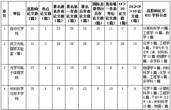 在工程学领域和计算机领域,发表高影响论文最多的均为自动化学院,各有15篇;在材料科学领域,发表最多的是材料科学与工程学院和武汉光电国家实验室(筹),各有10篇;在化学领域,发表最多的是武汉光电国家实验室(筹),有9篇;在临床医学领域,发表最多的是附属协和医院和附属同济医院,各7篇;在物理学领域,发表最多的是光学与电子信息学院,有8篇;在生物与生物化学领域,发表最多的是附属同济医院,有2篇;在药理学与毒理学领域,发表最多的是生命科学与技术学院,有4篇;在神经科学与行为学领域,发表最多的是基础医学院,有2篇。