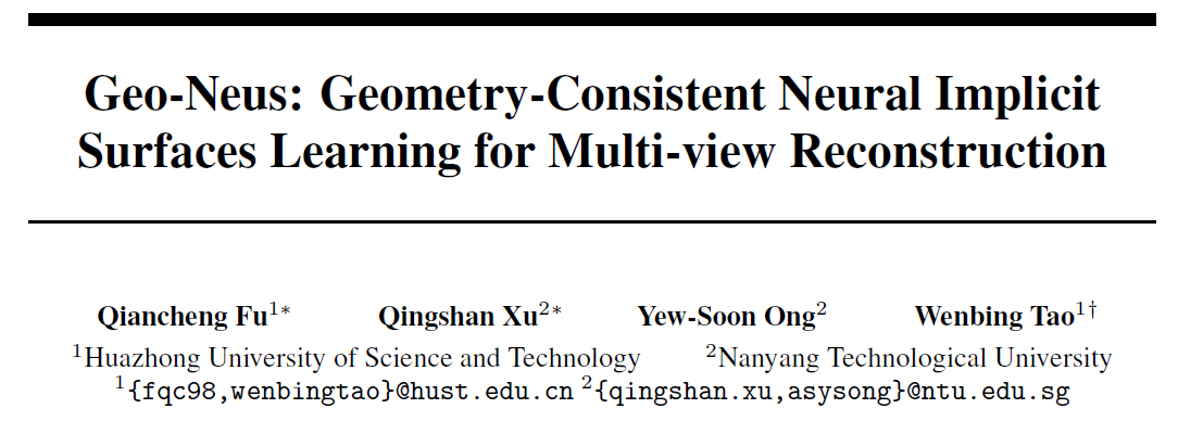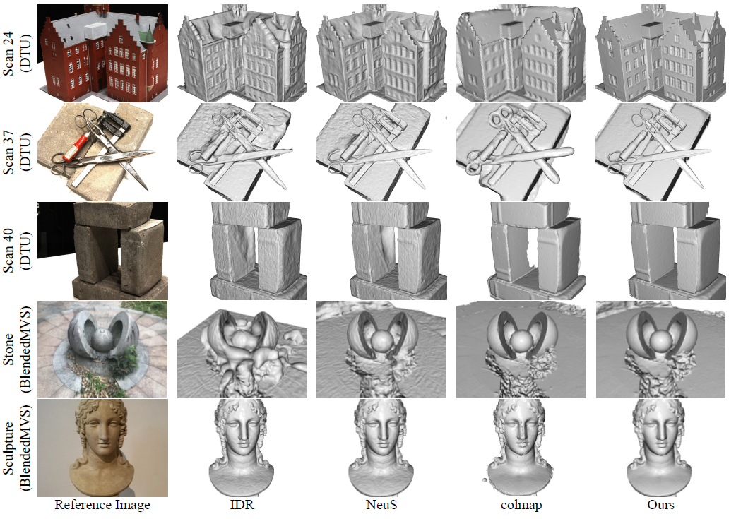 德赢官网2020级硕士研究生付前程在导师陶文兵教授的指导下联合新加坡南洋理工大学的徐青山博士及Yew-Soon Ong教授撰写的论文Geo-Neus: Geometry-Consistent Neural Implicit Surfaces Learning for Multi-view Reconstruction被NeurIPS 2022录用,付前程与徐青山为共同第一作者,陶文兵为通讯作者,德赢官网Vwin,德赢AC米兰官网为第一作者单位与通讯作者单位。论文提出几何形状一致的神经隐性表面学习Geo-Neus来完成多视图表面重建。首先从理论上分析了体渲染积分与基于点的符号距离函数(SDF)建模之间存在差距。进而为了克服这一差距,Geo-Neus方法利用SFM获取到的稀疏点集及多视图中的光度一致性直接定位到零符号距离位置来实现多视图几何优化。这使得SDF的优化具有无偏的特性,从而多视图几何约束能够专注于真实的表面优化,因而能够显著提高表面重建的精度。大量的实验表明,论文提出的Geo-Neus方法在复杂的薄结构和较大的平滑区域中都达到了高质量的表面重建,在DTU等数据集中评测领先于当前SOTA的神经隐式曲面学习方法约25%。