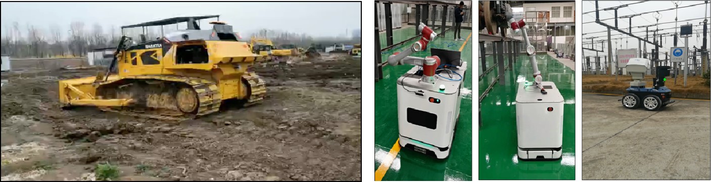 图2、中心自主研发的无人推土机自动驾驶感知与智能控制系统(左)、高铁动车组智能巡检无人系统(中)、多传感器融合的变电站智能巡检无人车(右)