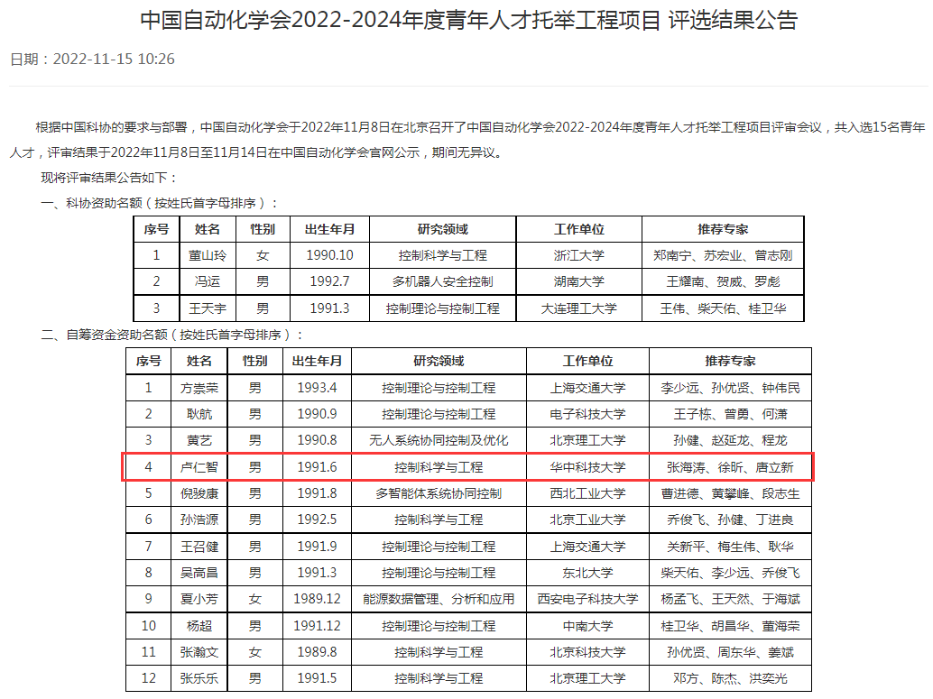 根据中国科协的要求与部署,中国自动化学会于2022年11月8日在北京召开了中国自动化学会2022-2024年度青年人才托举工程项目评审会议,共入选15名青年人才,德赢官网卢仁智副教授成功入选。