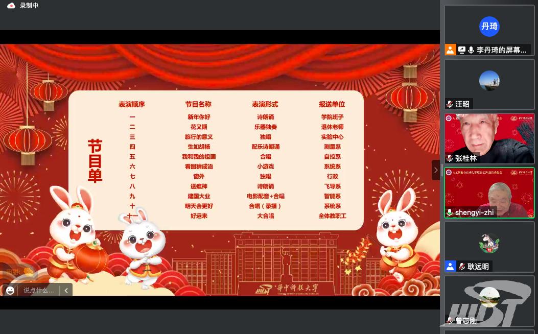 “在过去的一年里有那么多幸运,那么多欢笑,就让它在新的一年里破土发芽……新年,你好!”学院全体领导班子给大家送上“热腾腾”的新年祝福。退休老师们用乐器合奏表达了对美好未来的期待。诗朗诵与配音、看图猜成语小游戏、大合唱……各系老师们才华横溢,会议室里喜气洋洋,大家在留言区点赞、评论,热闹非凡。