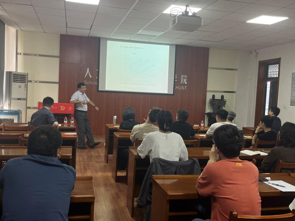 在本次讲座中,刘教授从自然界中生物种群的群集行为、社交网络中人类逃避恐慌的行为、工程应用中水下航行器和无人机的行为引出多智能体系统的群集问题。从单个智能体的动力学、智能体之间的信息交互、设计控制器使所有智能体实现一个全局目标等三个方面对系统进行分析和控制。从图论的概念中引出了强连通、有向生成树等多智能体系统的通信拓扑定义,首先介绍有领导者多智能体系统的编队控制问题,并从减少信息传输冗余、提高系统安全性和降低成本等方面描述了混合控制以及事件触发控制的优势,进一步设计了包含避障的混合事件触发脉冲控制策略,并给出了事件触发脉冲策略的设计机制和基于陀螺仪的避障机制,基于Lyapunov稳定性理论,得到了实现系统编队控制的充分条件。其次分别介绍了分布式脉冲控制策略和时滞脉冲控制策略,并在仿真中验证了所提控制策略的有效性。最后,针对高阶的异构多智能体系统,设计混合事件触发控制器实现了多智能体系统的编队控制。