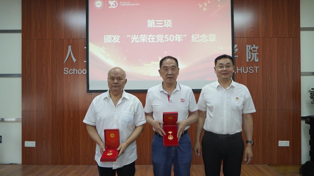 党委书记耿远明为两位党龄超过50年的老党员颁发了“光荣在党50年”纪念章,院党委书记耿远明、副院长张海涛、副院长钟胜分别为受表彰的先进基层党支部、优秀共产党员和优秀党务工作者颁发证书。