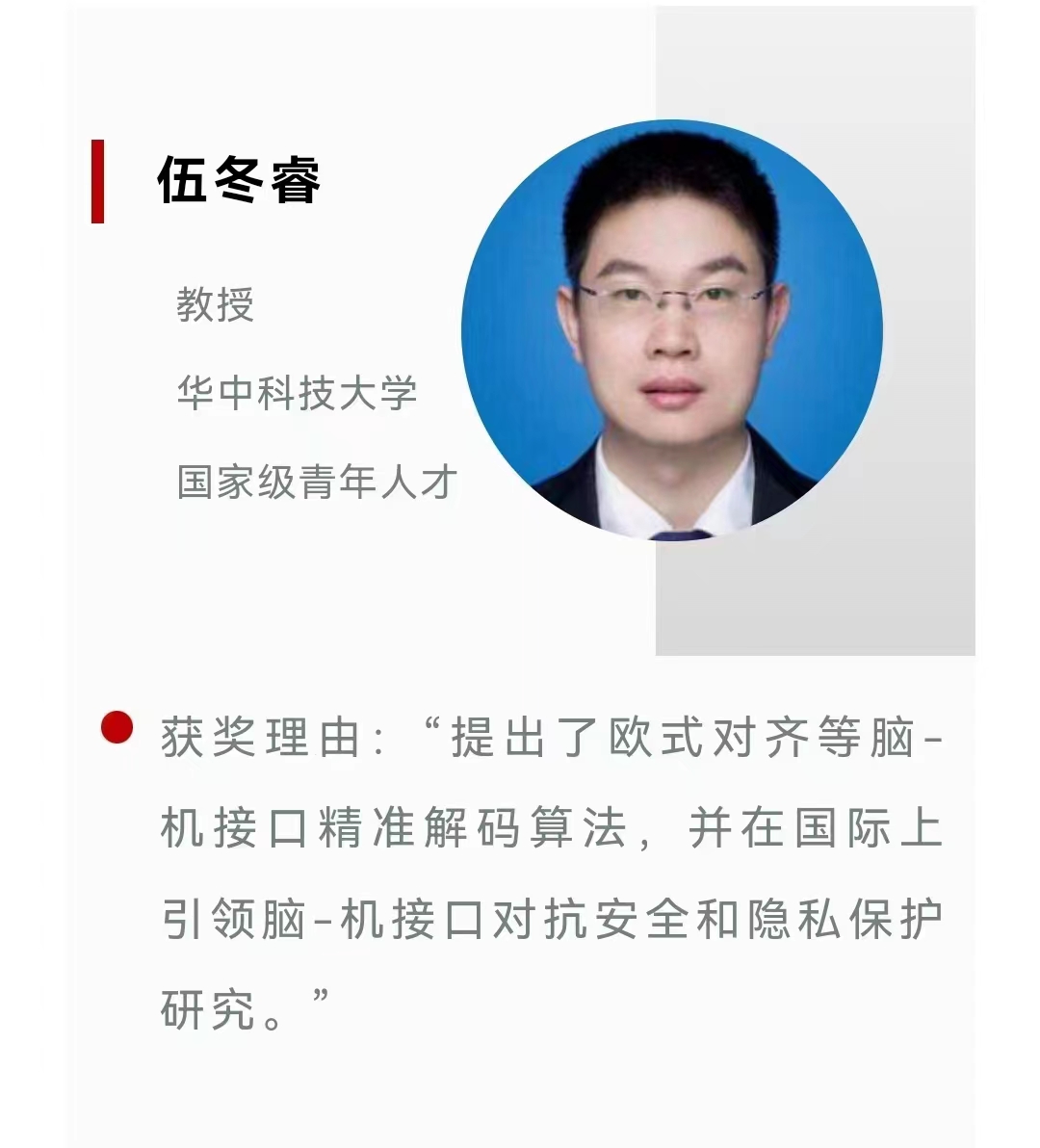 2023年6月,首届中国脑-机接口“华瑙学者奖”正式启动评选,德赢官网Vwin,德赢AC米兰官网教授、博士生导师、国家级青年人才伍冬睿教授荣获杰出青年奖。伍冬睿教授提出了欧式对齐等脑-机接口精准解码算法,并在国际上引领脑-机接口对抗安全和隐私保护研究。