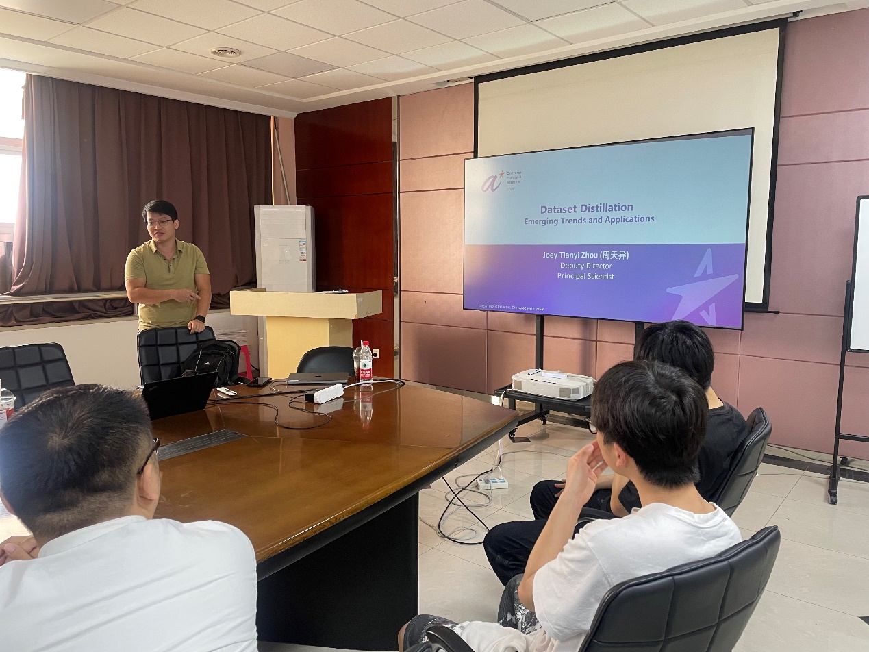 2024年4月1日上午9点30分,新加坡A*STAR(Agency for Science, Technology and Research)人工智能中心(Centre for Frontier AI Research)周天异研究员应肖阳教授邀请来德赢官网做了人工智能和机器学习相关研究的学术报告,报告的题目是"数据集蒸馏与修剪(Dataset Distillation and Pruning):精简机器学习效能"。报告会由肖阳教授主持,学院从事模式识别和机器学习相关研究的老师和学生共40余人参加了报告会。